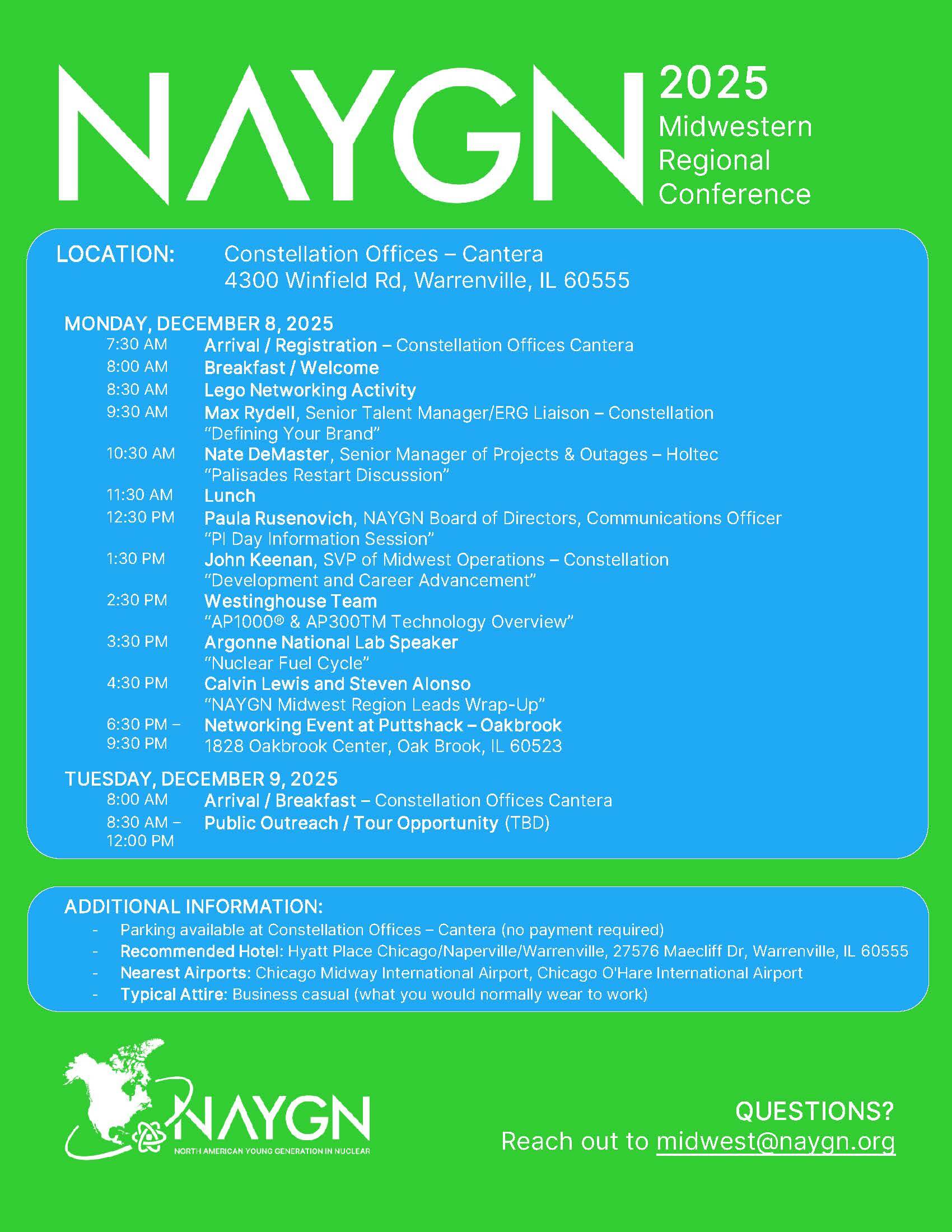 December 8th will be held at Constellation’s Midwest Headquarters in Warrenville, Illinois and will include local executive speakers, discussions with SMR and restart experts, and networking activities for local NAYGN members.