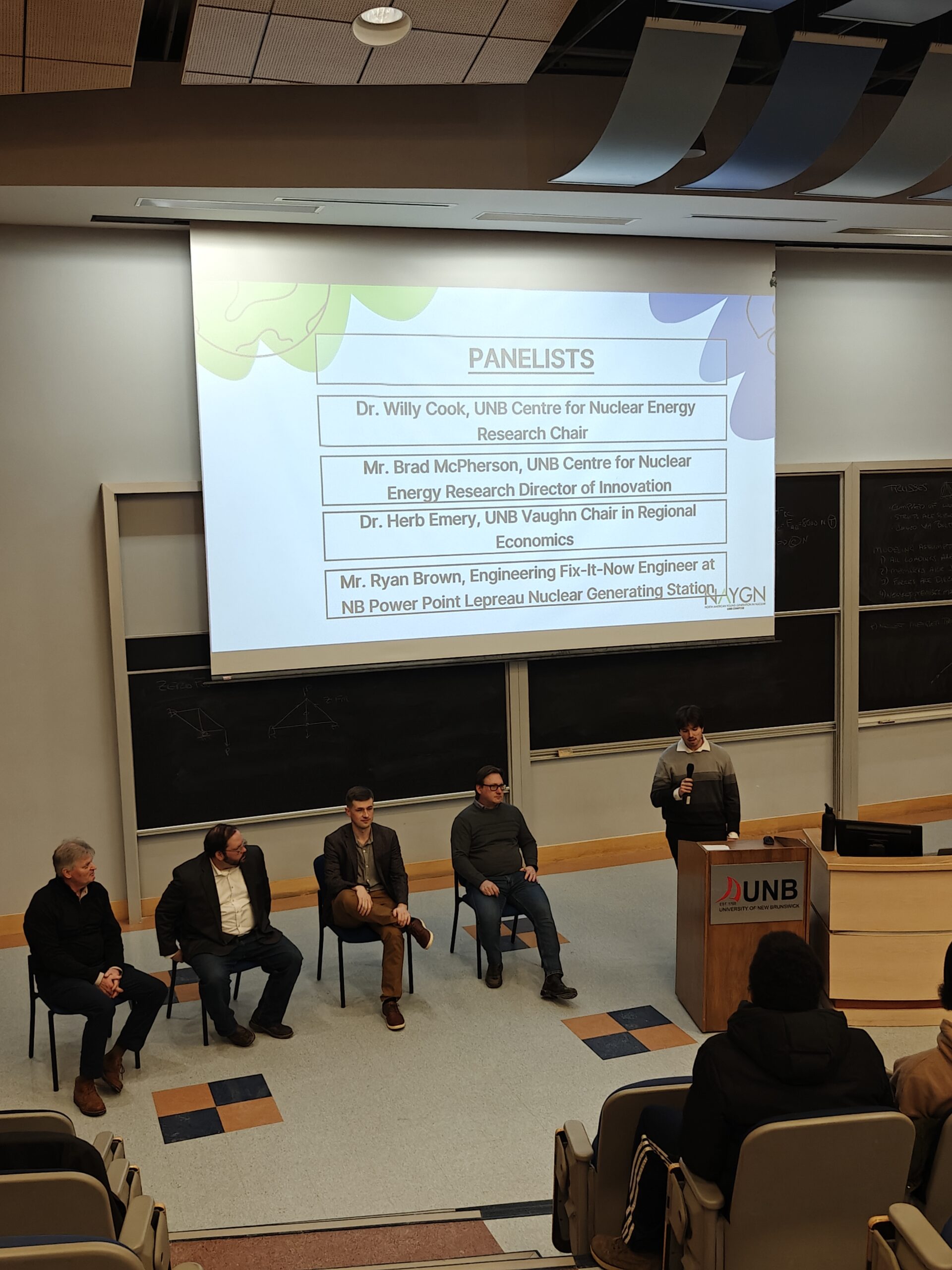 A diverse panel of professionals shared their expertise and insights throughout the event. Panelists included Dr. William Cook, Chair of UNB’s Centre for Nuclear Energy Research and Chemical Engineering Professor; Mr. Brad McPherson, Director of Innovation at UNB CNER; Mr. Ryan Brown, EFIN Engineer at NB Power’s Point Lepreau Nuclear Generating Station; and Dr. Herbert Emery, Chair of UNB’s Political Science Department and Vaughan Chair in Regional Economics.