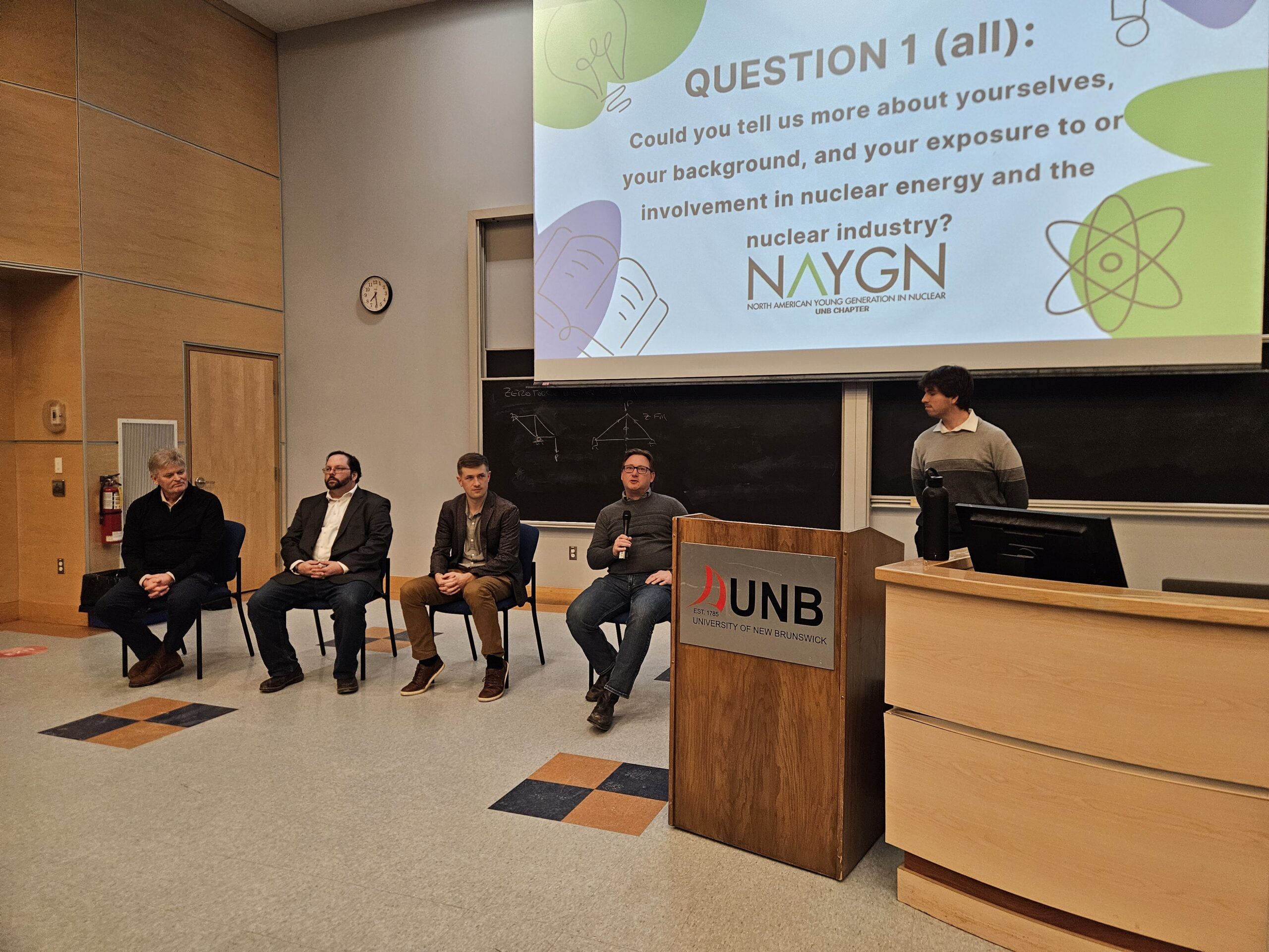 A diverse panel of professionals shared their expertise and insights throughout the event. Panelists included Dr. William Cook, Chair of UNB’s Centre for Nuclear Energy Research and Chemical Engineering Professor; Mr. Brad McPherson, Director of Innovation at UNB CNER; Mr. Ryan Brown, EFIN Engineer at NB Power’s Point Lepreau Nuclear Generating Station; and Dr. Herbert Emery, Chair of UNB’s Political Science Department and Vaughan Chair in Regional Economics. The panel was moderated by Michael Alder, co-lead of NAYGN-UNB.