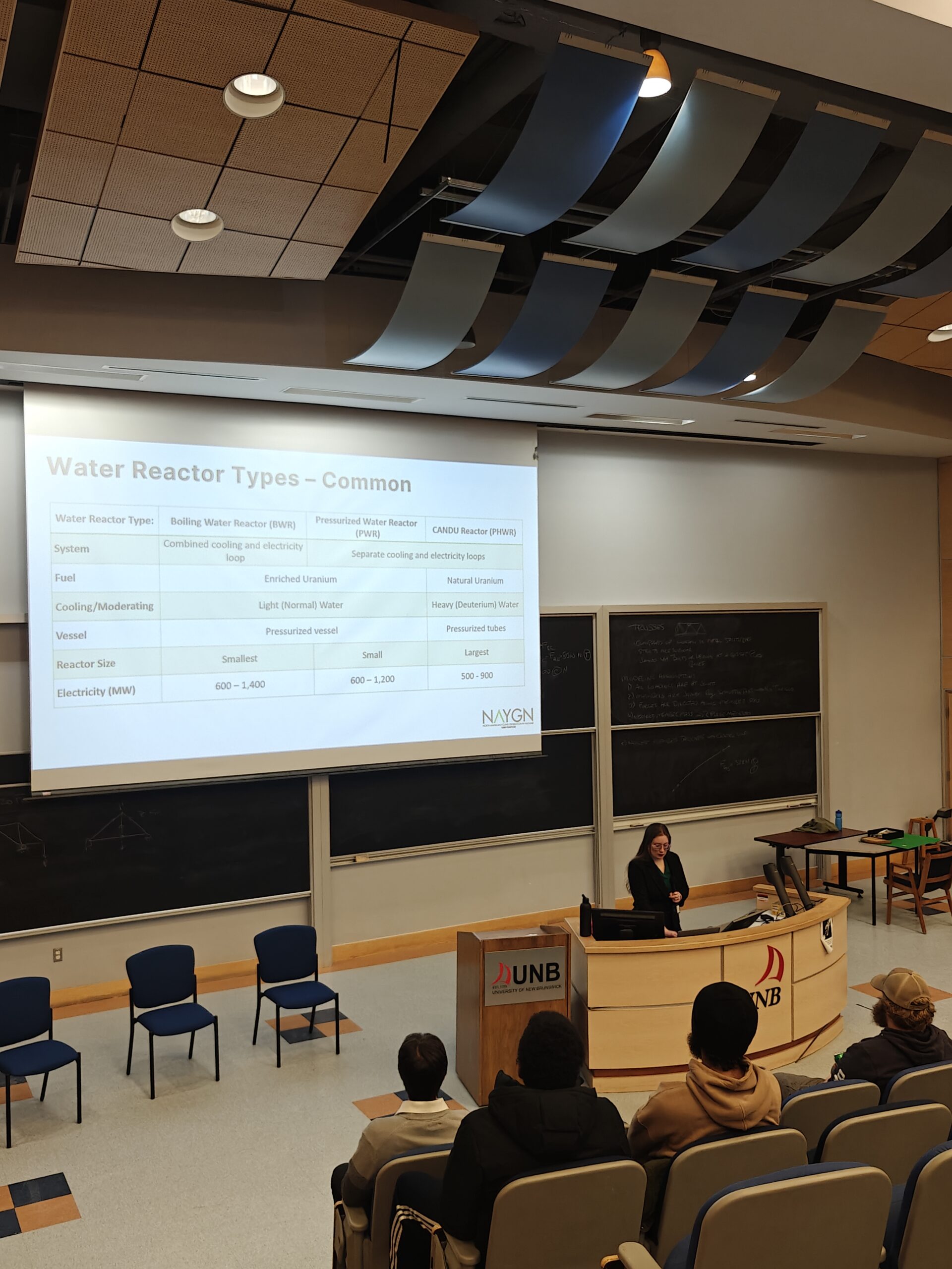 The NAYGN – University of New Brunswick (UNB) chapter recently hosted Introduction to Nuclear Energy: Nuclear Power and Beyond, an educational and discussion-based event designed to introduce students from a wide range of disciplines and backgrounds to the fundamentals of nuclear energy. The session aimed to build foundational knowledge while fostering open dialogue on the environmental, economic, and social dimensions of nuclear power.