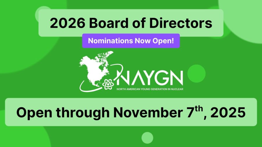 Any NAYGN member may be nominated to be part of the Board of Directors. NAYGN's Board is responsible for leading the organization to ensure that NAYGN supports the needs of members and the larger nuclear industry. Responsibilities include planning initiatives centered on the four pillars of NAYGN and overseeing strategic committees serving NAYGN’s mission and purpose. If you have ideas for how NAYGN should operate and what initiatives we should pursue in the future, consider submitting your name during the open nominations window!